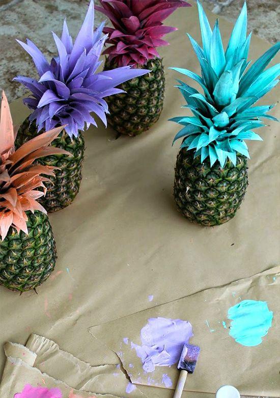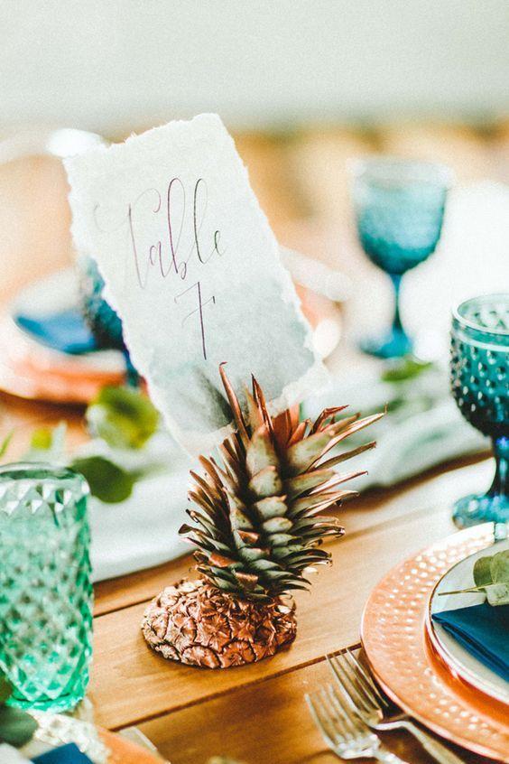 Puedes optar por mucho color o sencillamente por mucho verdes y blanco, si deseamos quedarnos en tonos más neutros. Las invitaciones pueden ser de este refrescante y veraniego estilo, a juego con la forma de enumerar las mesas, el sittingplan, el libro de firmas de los invitados (en este caso ¡hasta puede ser una plancha de surf si amamos ese deporte, o una gran hoja verde natural) Si quieres que tus invitados no paren de hacer fotos y subirlas a sus redes, este estilo de decoración hará las delicias de los más instagramers. Detalle cuqui: las galletitas decoradas del mismo estilo y los centros florales dentro de piñas naturales.
