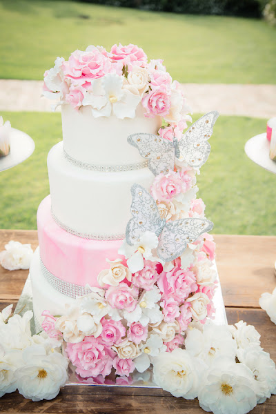 Una tarta nupcial de varios pisos decorada con rosas en cascada acompaña de varias bomboneras con chucherías y bandejas con pie plateado para unos candybar decorados con florecitas preciosas.