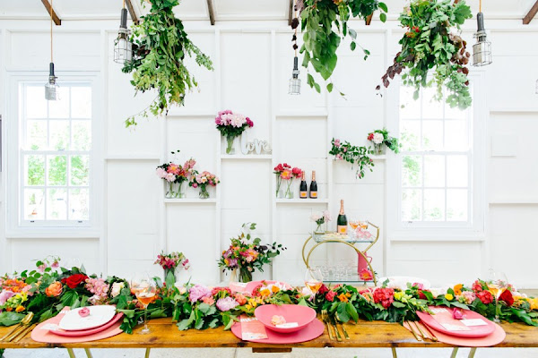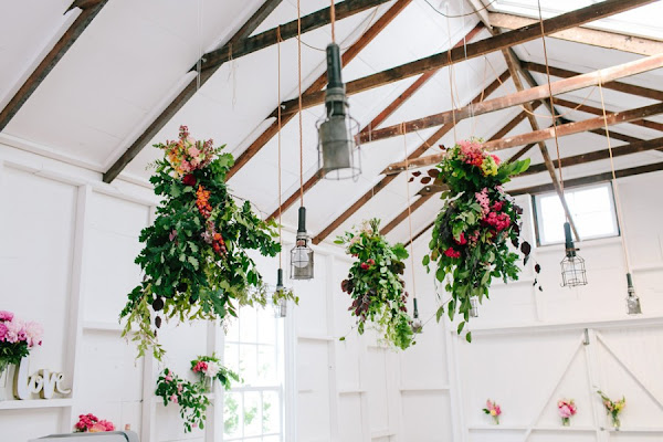 Si el restaurante, o finca elegida tiene vigas visibles en el techo, aprovecha para crear ramos de flores colgantes o aros decorados, como podéis comprobar el resultado es muy bonito, y llenará de color la estancia.