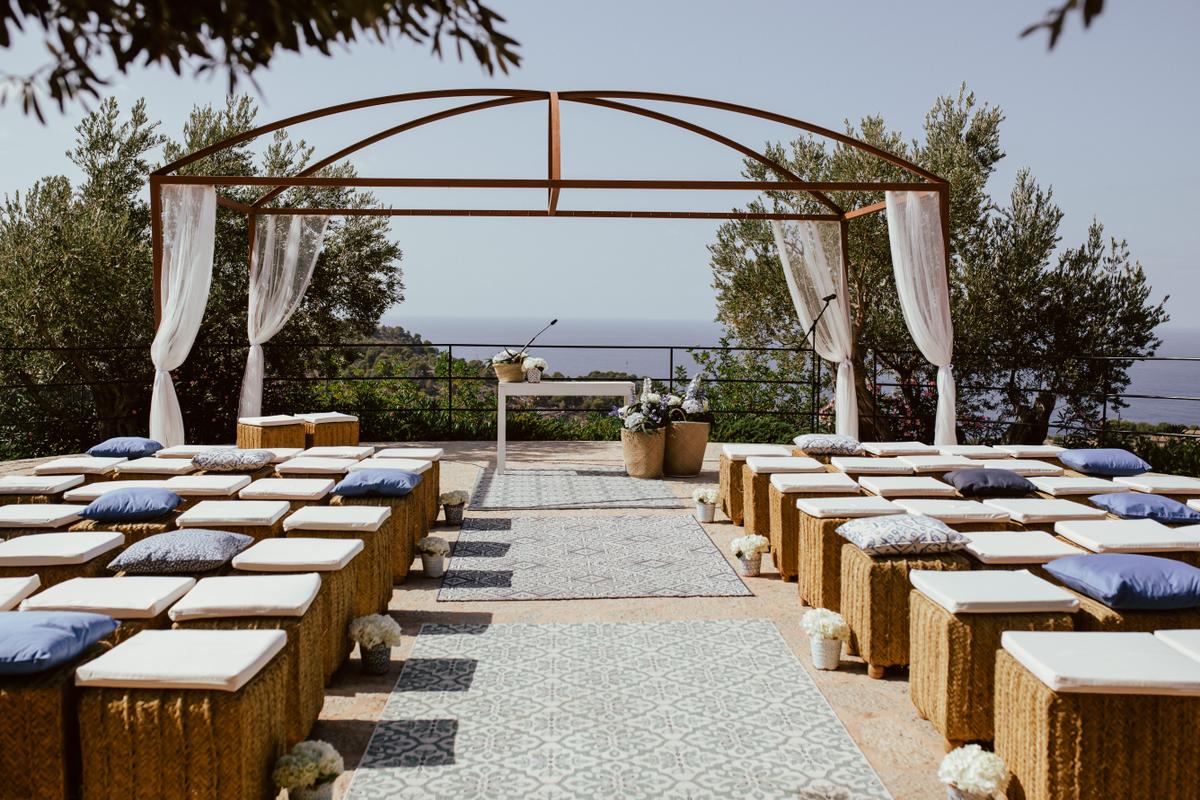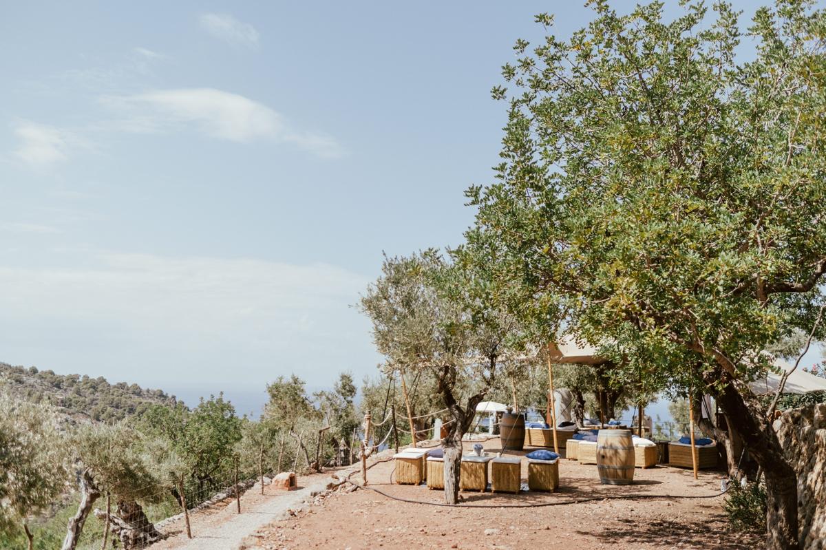 Nuestro equipo de decoración hizo un excelente trabajo sin robar protagonismo a los olivos que rodean el mirador y las vistas. Una combinación sutil y elegante en tonos azules para crear un espacio de estilo mediterráneo.