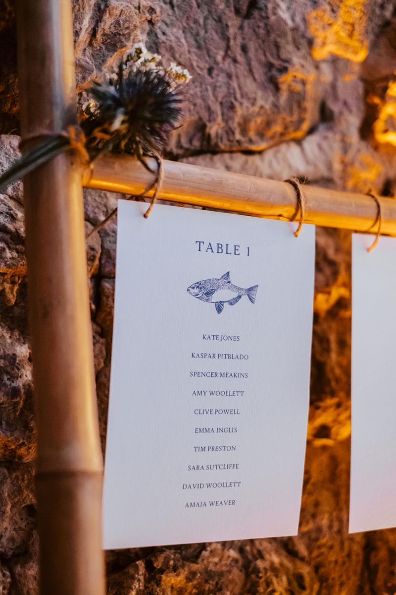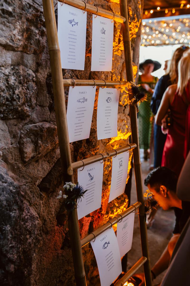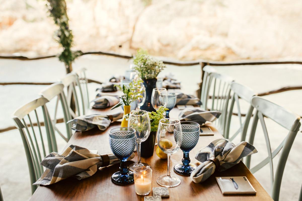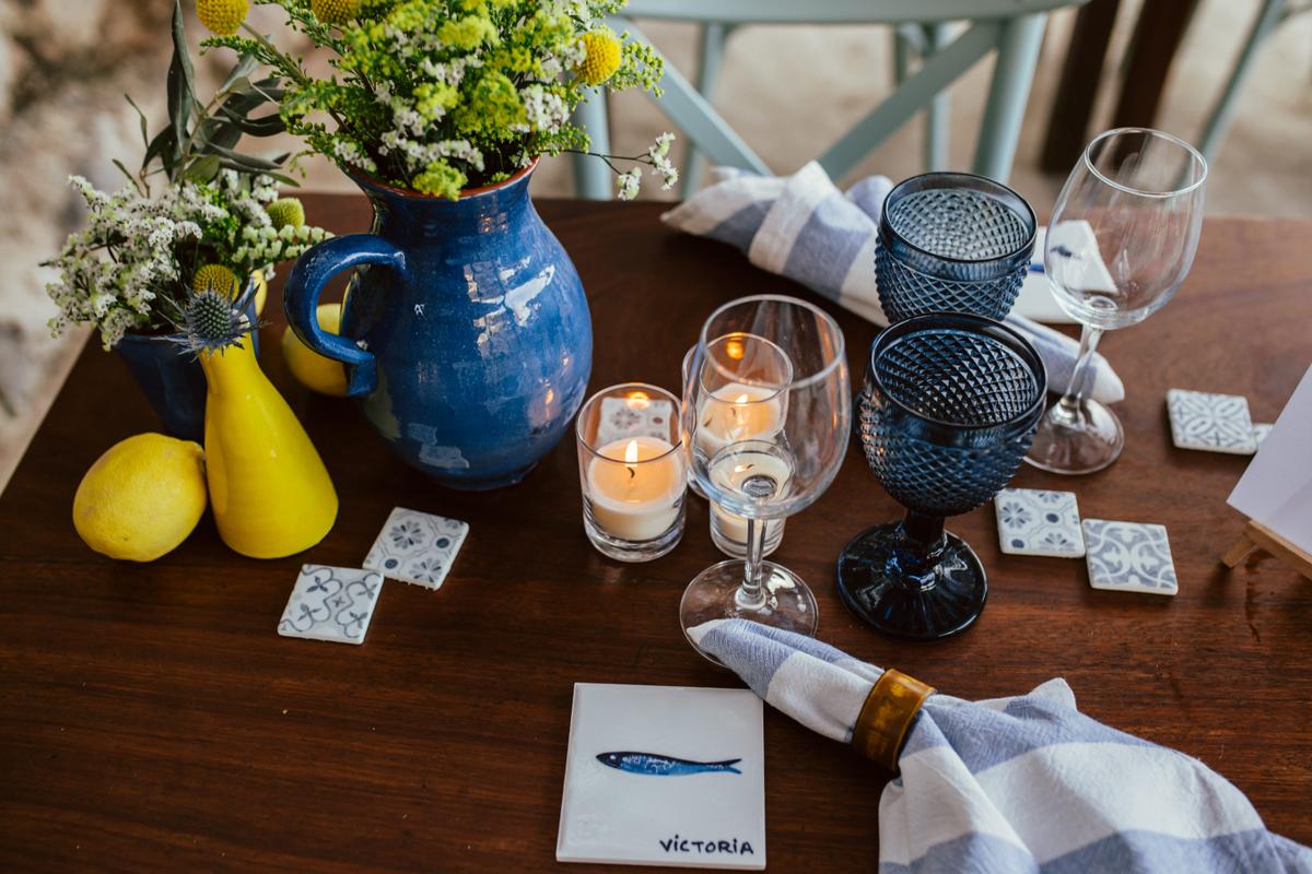 Para la cena decoramos este pintoresco restaurante con un cielo estrellado de fairy Lights, diseñamos jarras, jarrones y vajilla que nos hicieron a mano artesanos de la isla con barro, confeccionamos servilletas para la ocasión, y elaboramos unas baldosas personalizadas a mano con el nombre de cada uno de los invitados, un precioso regalo para recordar Mallorca.