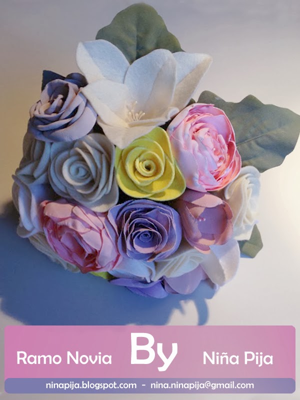 La tendencia en 2014 para ramos de novia es la combinación de formas y colores así como de materiales y a esta tendencia nos hemos apuntado en niña pija y hemos comenzado el año combinando fieltro con tela teñida y velada y puntilla.