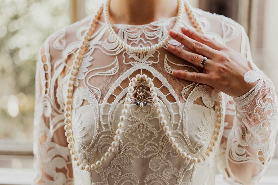 El vestido, obra de Nicolás Costura, ligero, fluido, de crepe de seda natural, sobre el que se añadio un tul bordado en hilo, con una abertura centrada y sin cola para darle un toque mas modernos, mas urbano y para completar botones de terciopelo negro.
