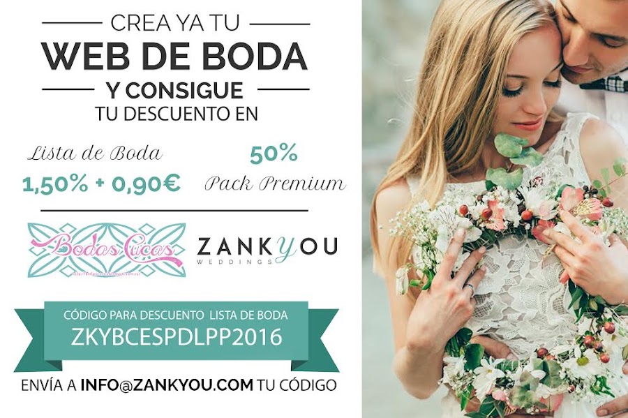 Si os ha gustado la idea... estáis de enhorabuena porque Zankyou Weddings ofrece un promocode exclusivo para l@s lector@s de BodasCucas. Tan sólo tenéis que activarlo y ya podréis conseguir automáticamente todos estos descuentos: Descuento en las tarifas de tu lista de bodas y 50% en el pack Premium para disfrutar de plantillas exclusivas, música de fondo, URL personalizada y transferencias ilimitadas ¡Entre otras ventajas!