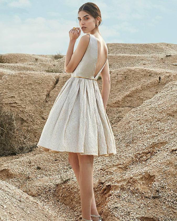 Manteniendo un estilo más sobrio y al tiempo muy elegante, nos encontramos con las propuestas de Cristina Tamborero, con un vestido en color entre champagne y beige, con amplio escote a la espalda y falda en forma de “A”.