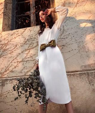 Si has desechado definitivamente el vestido largo y la tradicional cola, tienes varios largos de vestido, desde medio muslo al largo midi, y también a la altura de la rodilla. Todo dependerá de tu altura y también de tu fisionomía. Verónica Miranda nos propone un vestido muy suelto y femenino de largo midi, que sin duda estiliza la figura, con pechera, mangas y borde inferior en chantilly, que dan un toque muy femenino.
