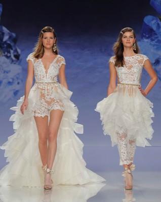 José María Peiró aporta a la moda nupcial en vestido corto este diseño más clásico y de efecto elegantísimo por la sencillez y por la riqueza de la tela en la que está confeccionado y Verónica Miranda elige un dos piezas de falda acampanada y cuerpo abotonado con manga larga en el que el plumetti le da el tono vaporoso y romántico.