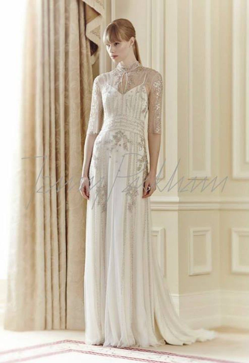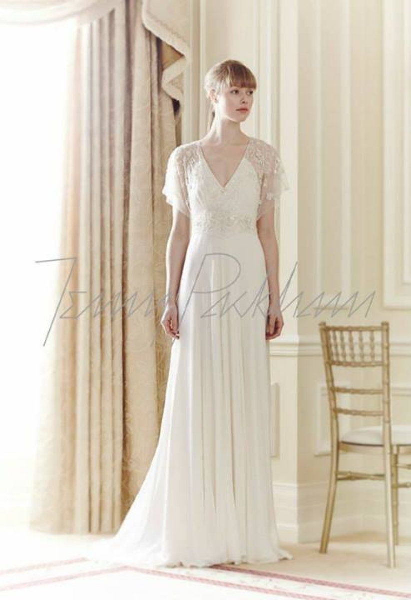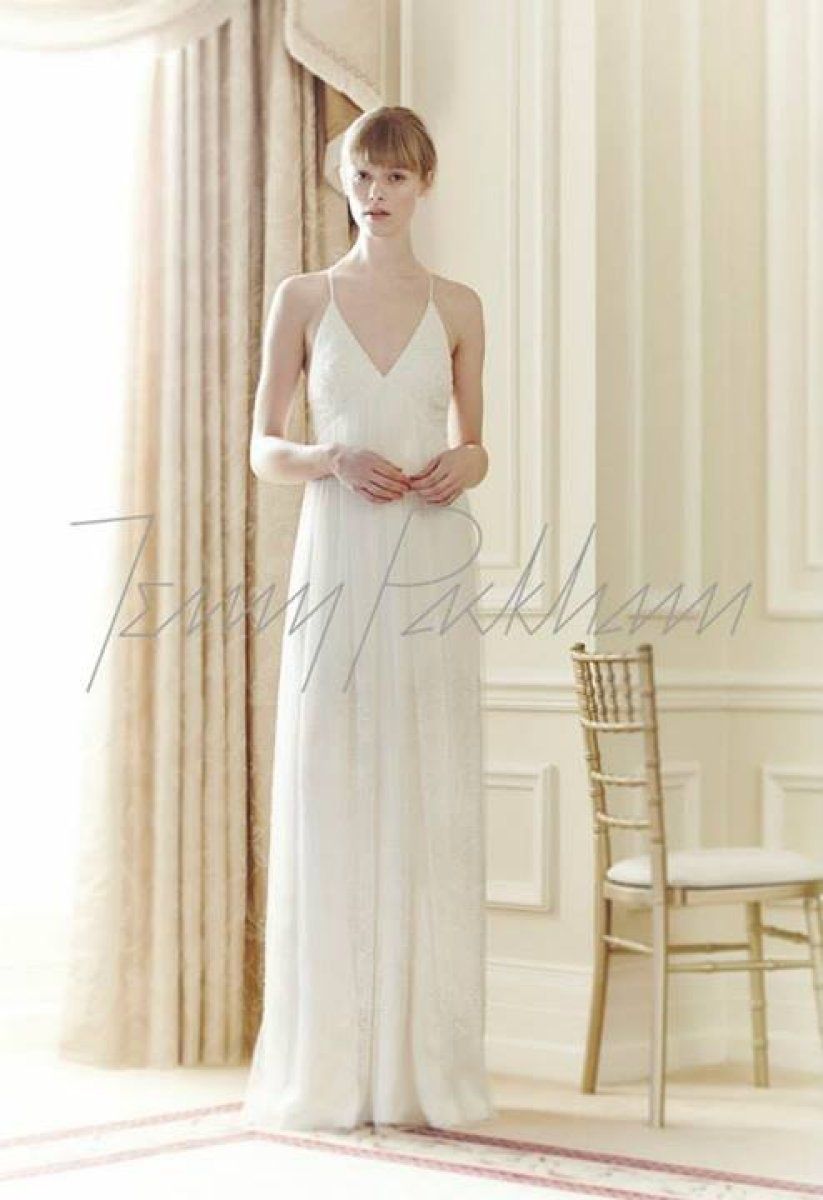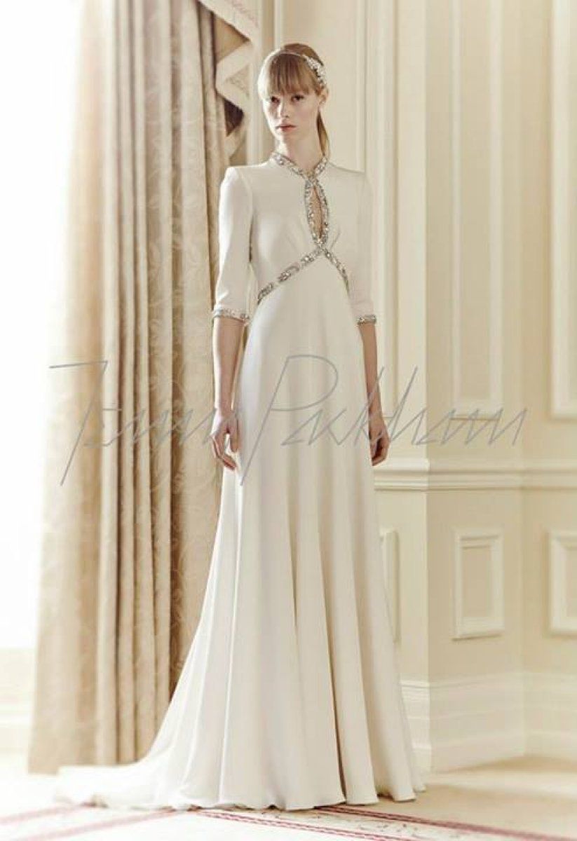 Una característica de los vestidos de Packham son los detalles en pedrería y bordados sutiles en sus vestidos. Casi siempre optando por telas que recuerdan a los looks medievales, los escotes los dibuja en pico en una novia lánguida y pálida, pero tremendamente elegante, que simboliza el estilo british a la perfección.