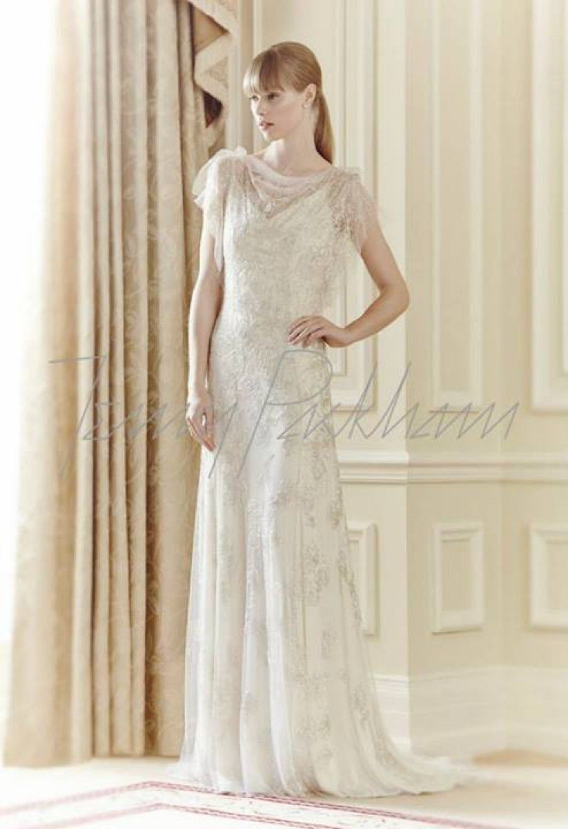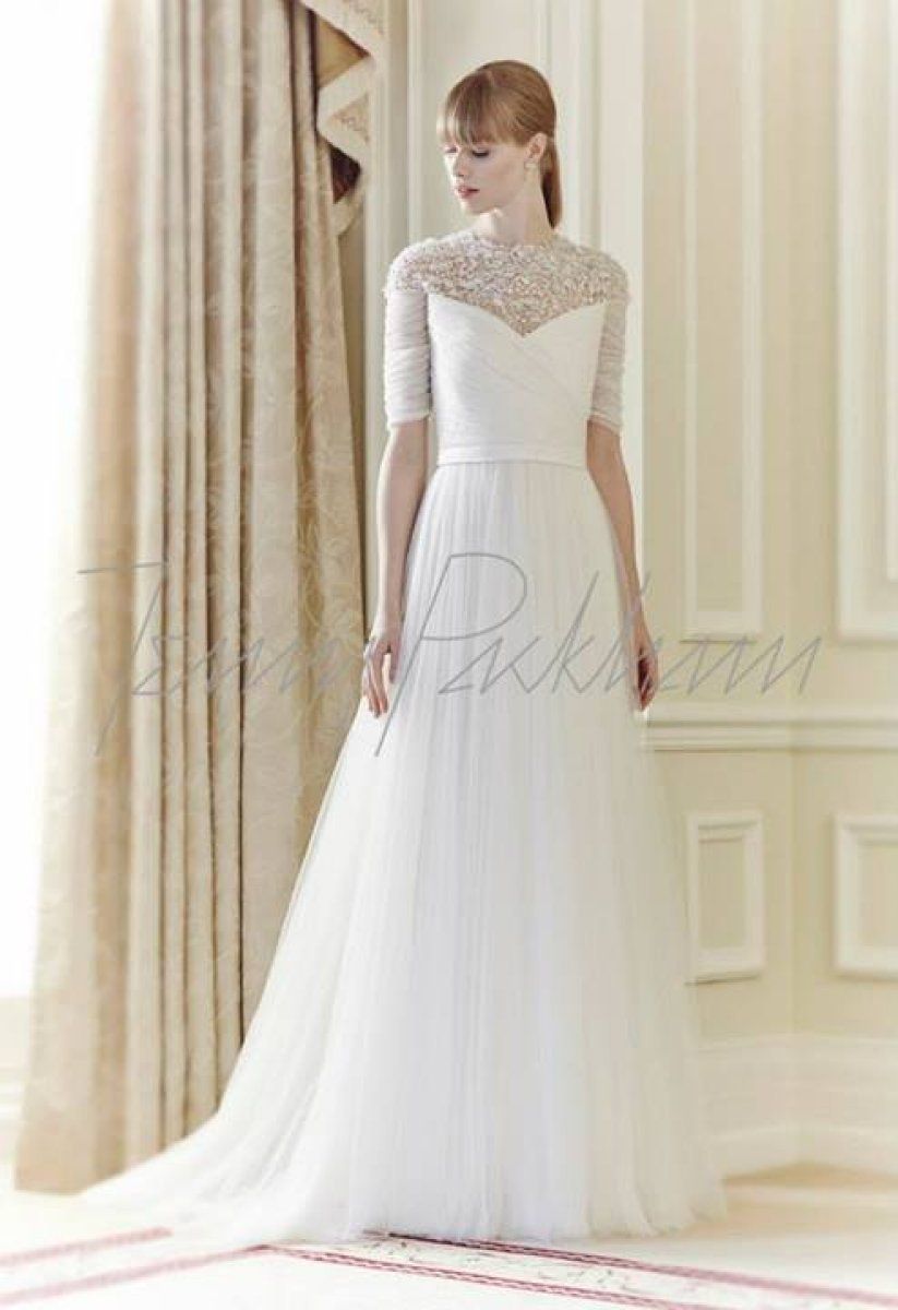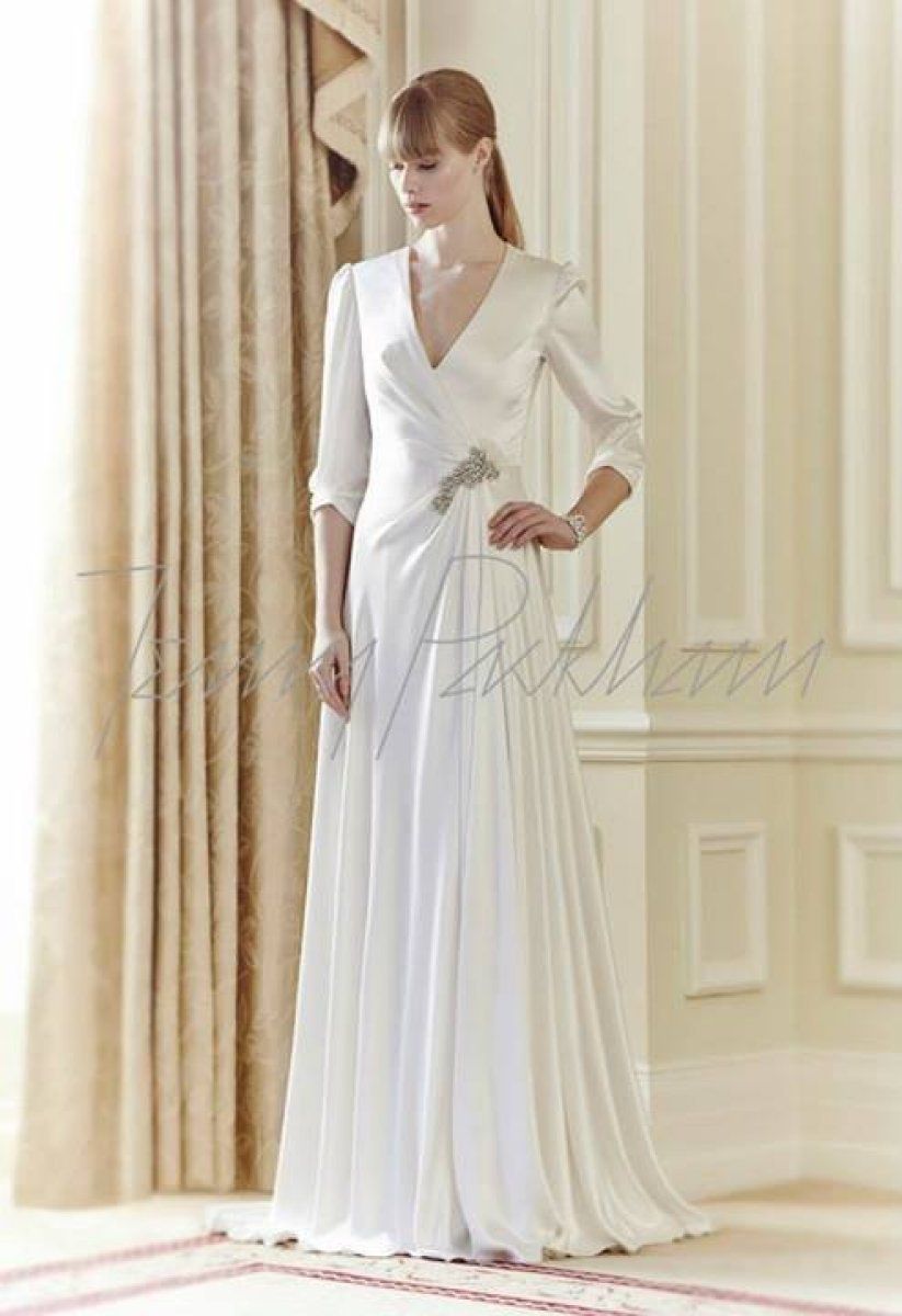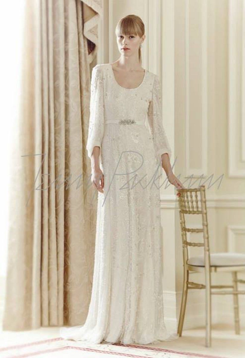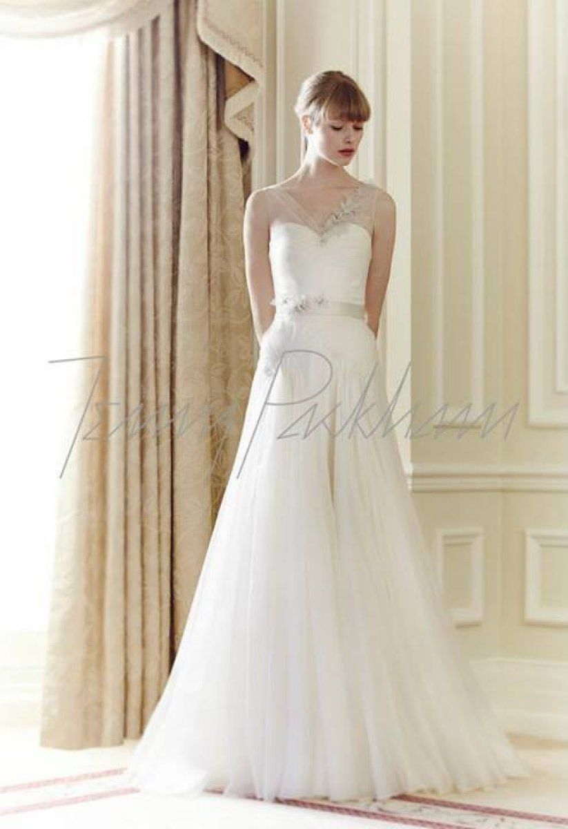 Una característica de los vestidos de Packham son los detalles en pedrería y bordados sutiles en sus vestidos. Casi siempre optando por telas que recuerdan a los looks medievales, los escotes los dibuja en pico en una novia lánguida y pálida, pero tremendamente elegante, que simboliza el estilo british a la perfección.