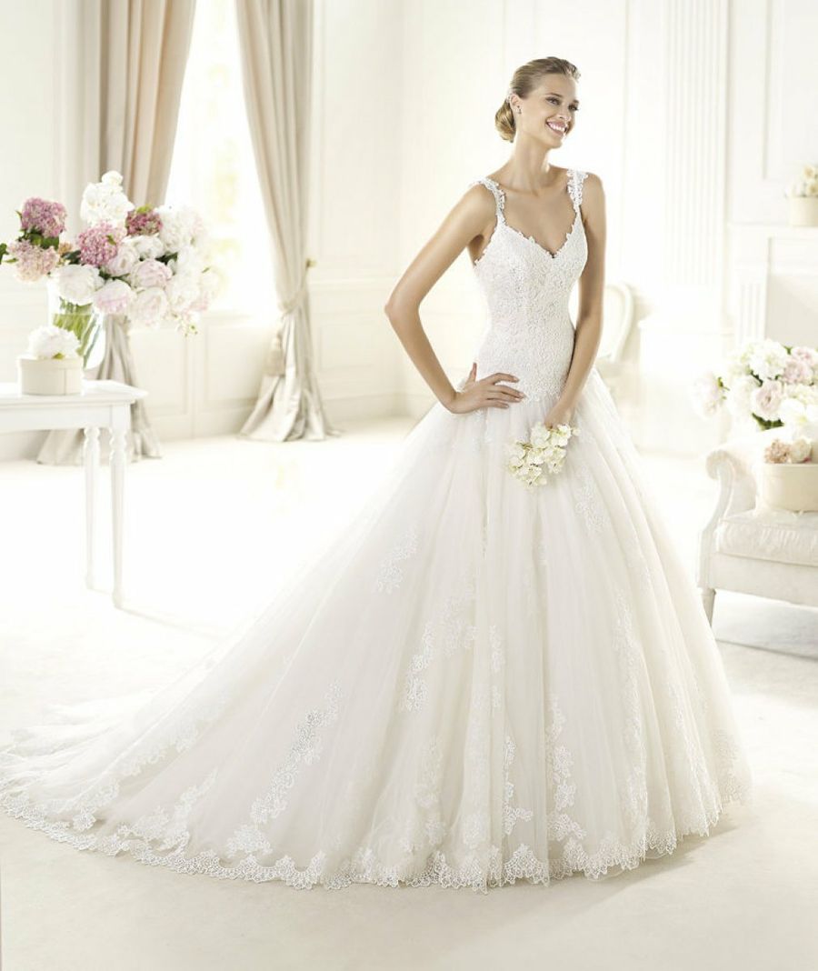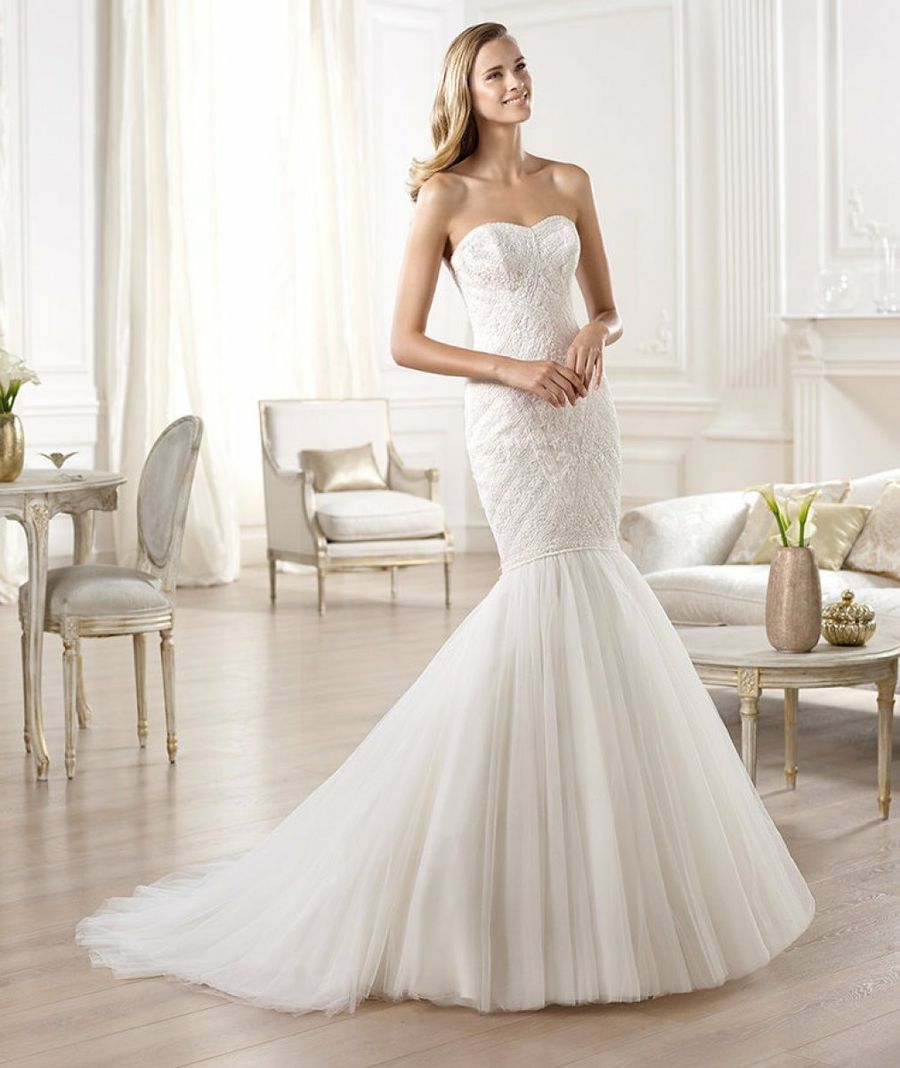 En Pronovias encontramos cortes de sirena que cubren sus caídas de tul liso, aunque también modelos que convierten a este tejido en el máximo protagonista. Un ejemplo es el modelo Ores de la colección Fashion, definido por un corte imperio con cuerpo de pedrería y faldón de tul. Además, también encontramos ejemplos de tul bordado, diseños perfectos para gustos más clásicos.