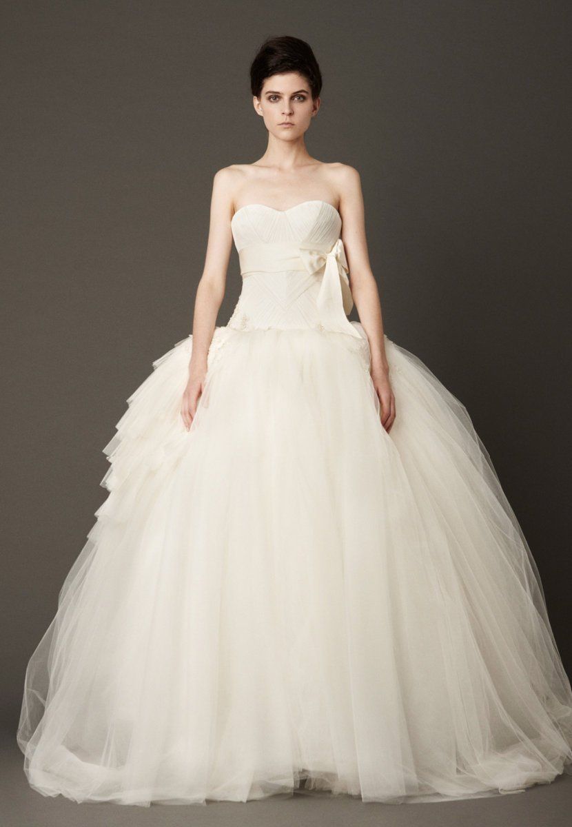 Los diseños de Vera Wang parten de un mismo patrón: cuerpos entallados definidos por los detalles para acabar en un gran faldón que alcanza todo el protagonismo.