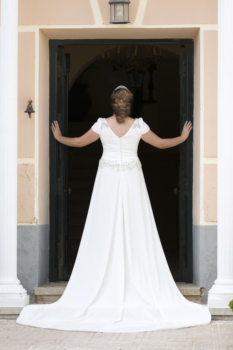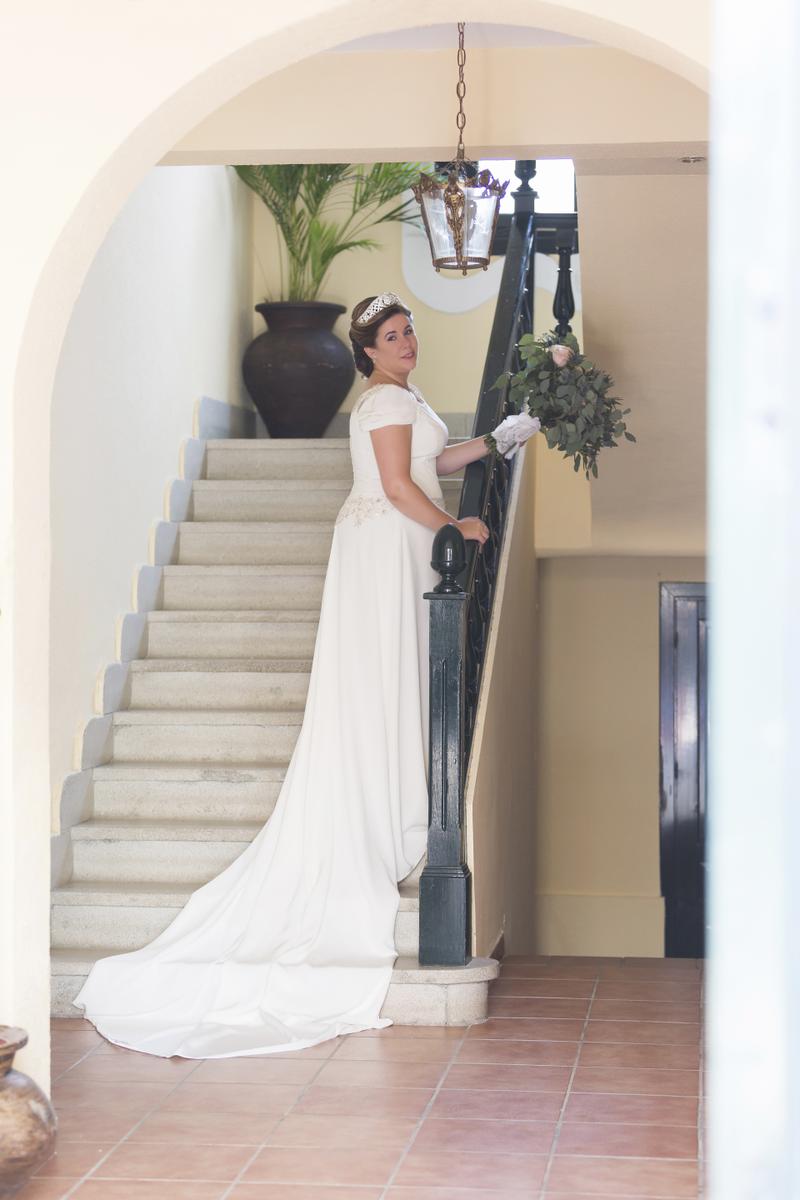 La boda de Rocío se celebró en Plasencia. Con un vestido de crepe seda, con sobrefalda de muselina, encajes de chantilly y plumetti.
