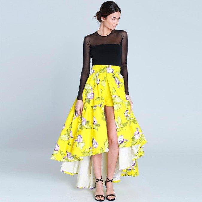 No solo con vestidos pueden ir las invitadas, también con un dos piezas, ya sea de falda o de pantalón, eso sí un pantalón amplio y vaporoso. También encontramos diseños atrevidos para el estilo bridal de invitada: la combinación de falda en cascada sobre shorts.