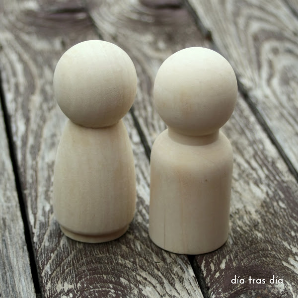 Compré estos taruguillos de madera para hacer unos “Peg dolls”, que así se llaman a estas piezas que luego, tras pasar por “chapa y pintura” se convierten en unos simpáticos muñequitos, con idea de hacer con ellos parejas de novios personalizados.