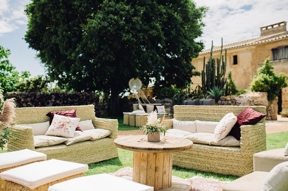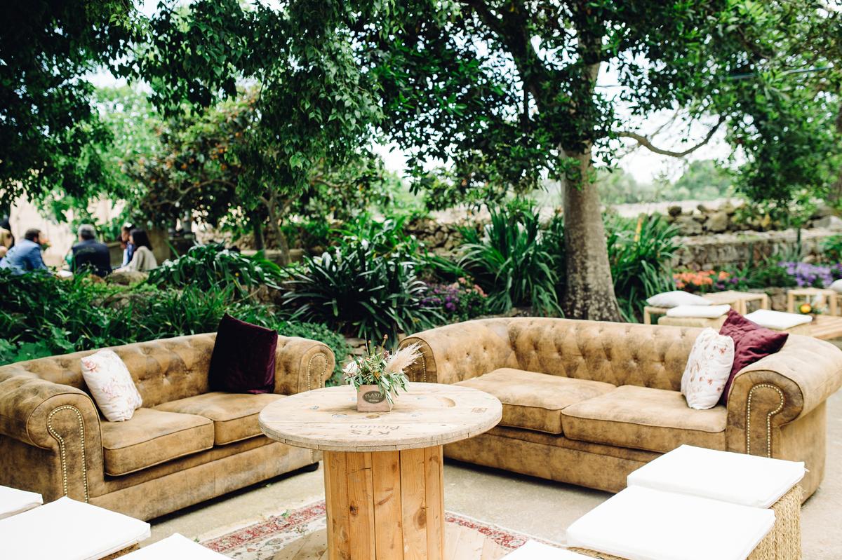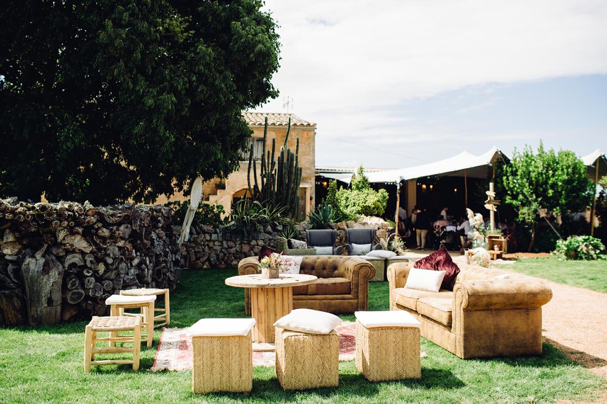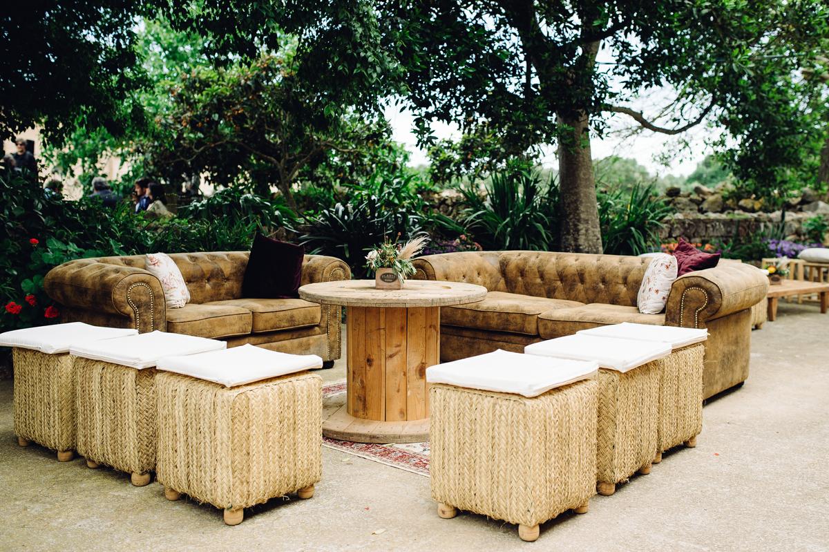 Ubicamos diferentes espacios donde los sofás Chesters junto con los sillones y nuestros chill-outs mallorquines hicieron las delicias de los invitados. Cada espacio se complementó con alfombras de corte clásico y nos atrevimos con bobinas de cable industriales que hacían la función de mesa auxiliar.