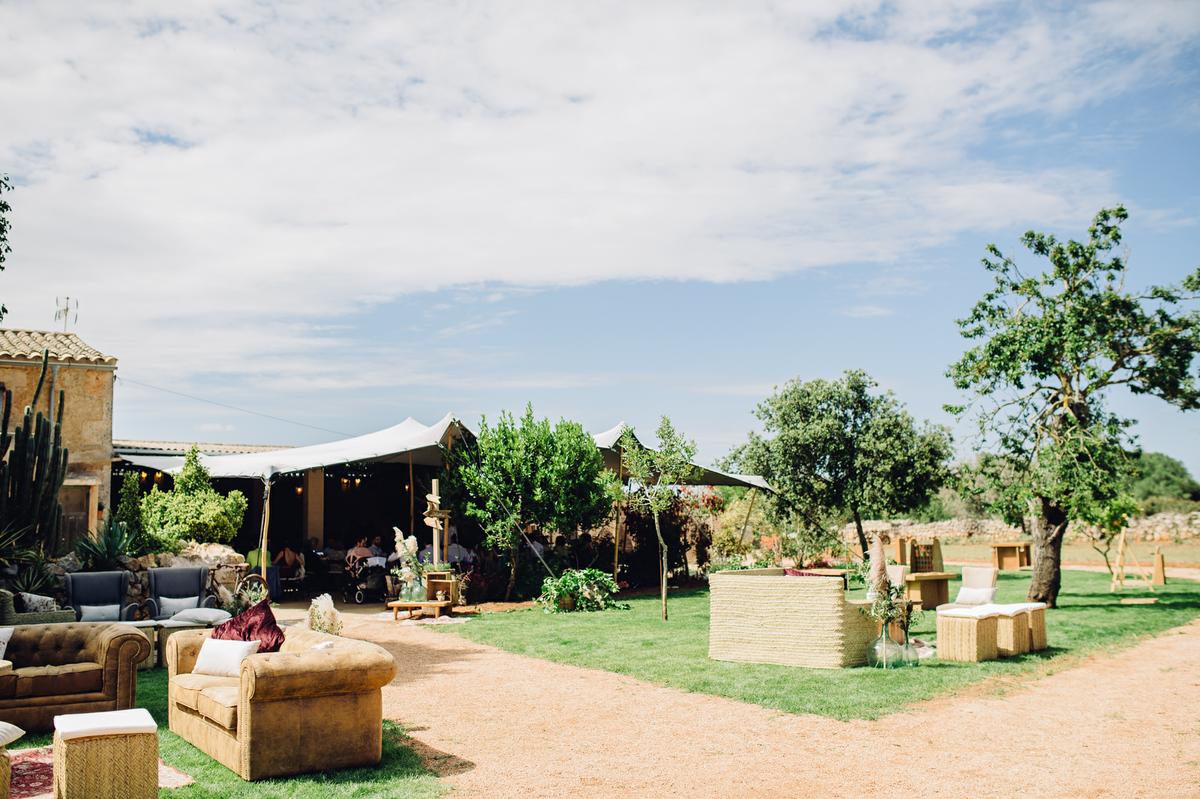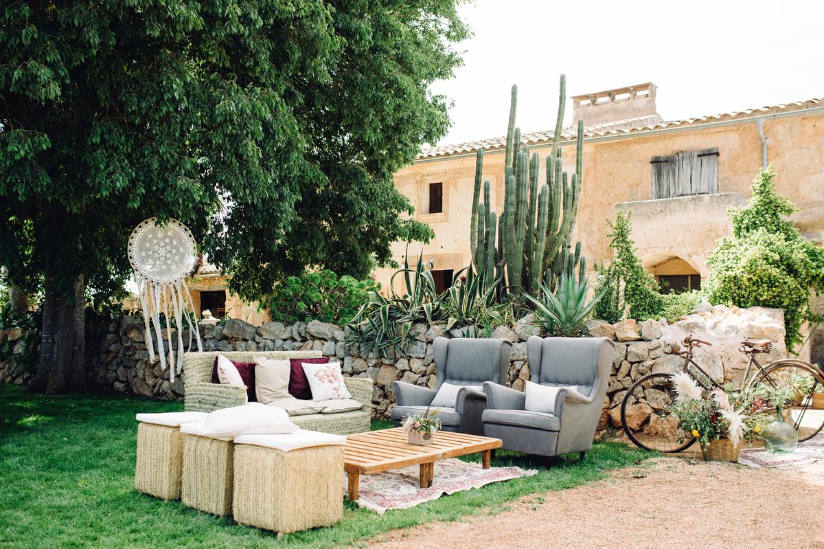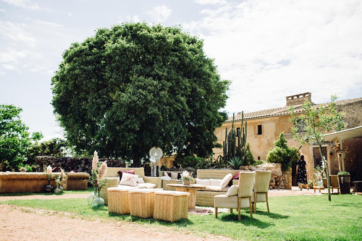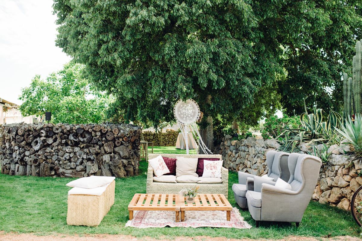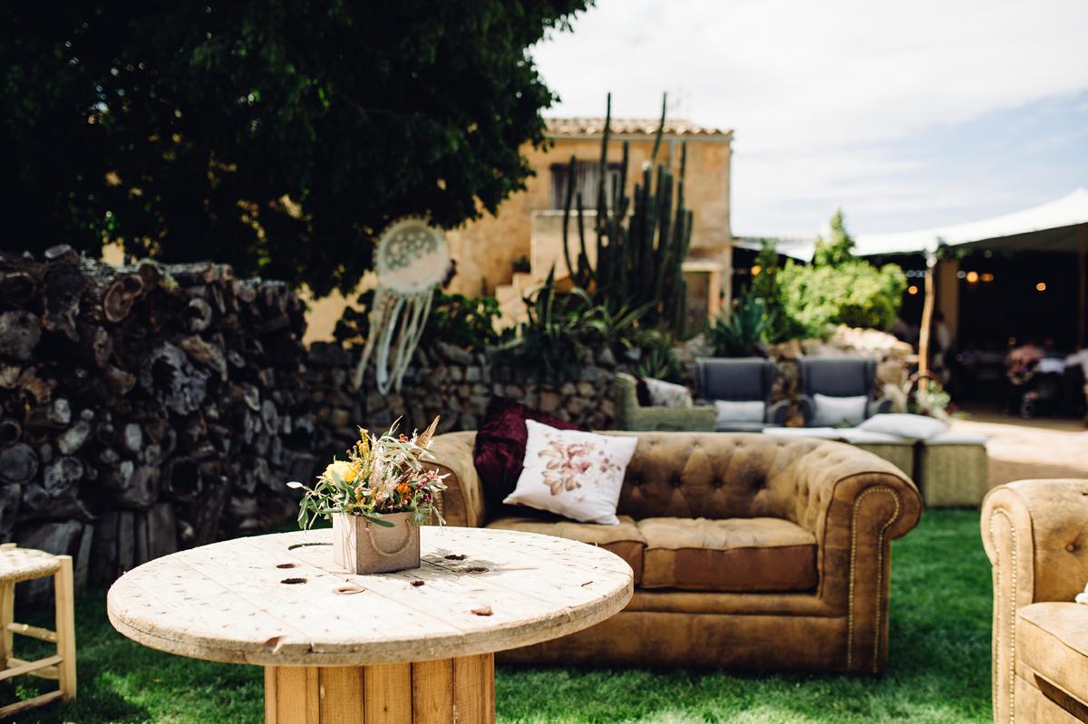 Ubicamos diferentes espacios donde los sofás Chesters junto con los sillones y nuestros chill-outs mallorquines hicieron las delicias de los invitados. Cada espacio se complementó con alfombras de corte clásico y nos atrevimos con bobinas de cable industriales que hacían la función de mesa auxiliar.