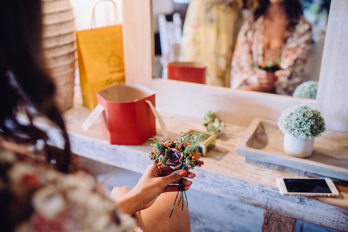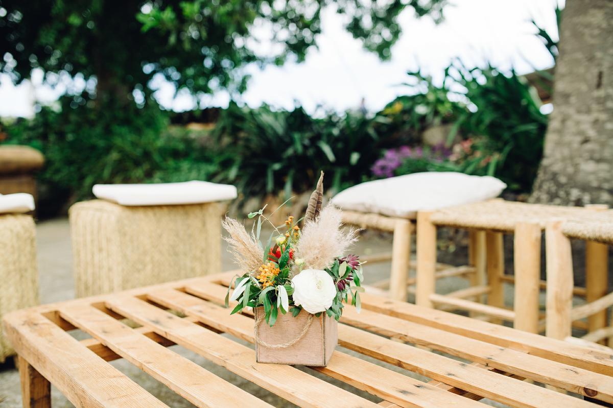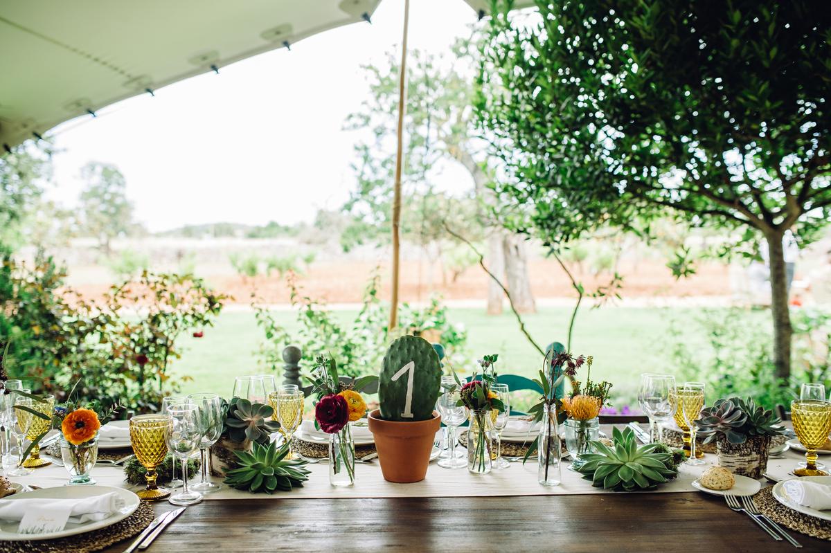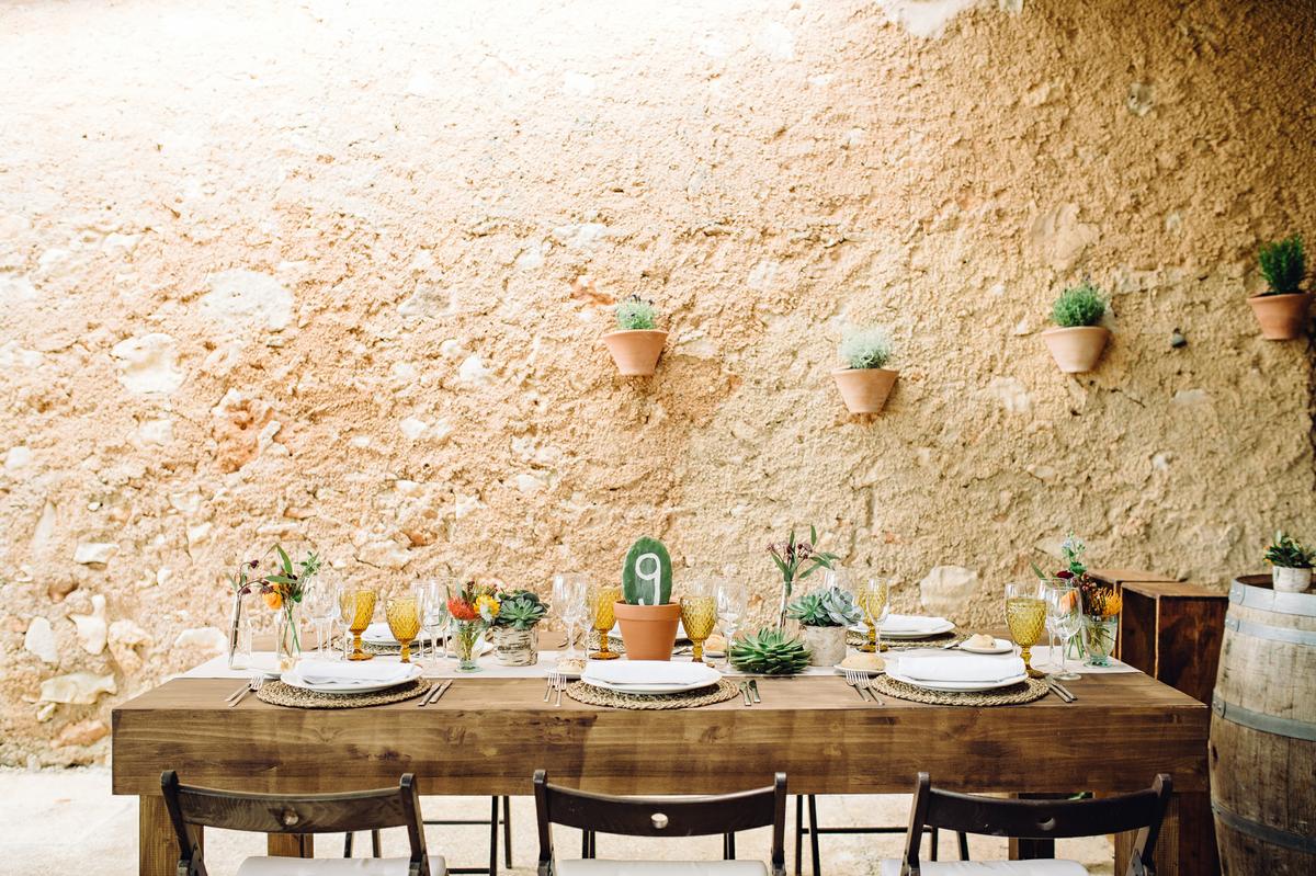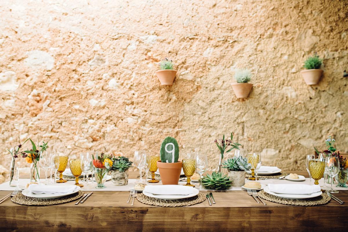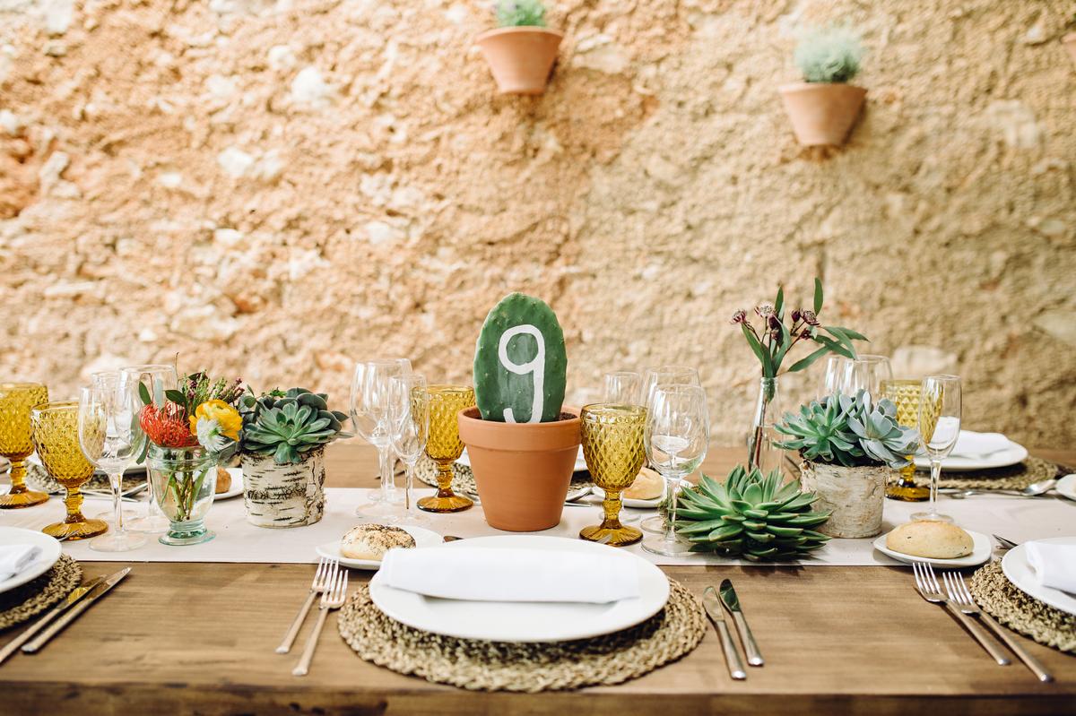 Y cómo no, todos y cada uno de estos espacios se completaron con arreglos florales de pequeño formato en base de cristal repitiendo la misma selección floral que se repetiría en todo el evento. Los cactus y plantas crasas fueron las protagonistas de todo el floral de la boda, ¡también incluimos las pampas y las proteas! Pero un guiño especial a los cactus que también formaron parte del diseño gráfico de la boda (minutas, nombres de invitados…).