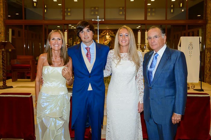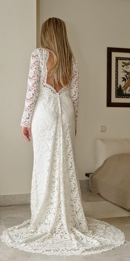 La novia espectacular con un vestido de encaje con un corte limpio estilizando la figura y focalizando la atención en una espalda de vértigo. Realizado por Beatrice Sebastian, amiga de los novios, en base a un boceto que Zita tenía y con encajes de Jose Maria Ruiz.