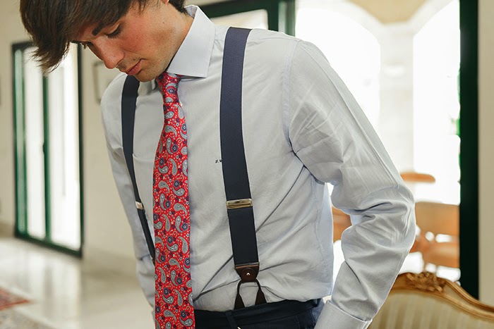 The groom wore a blue suit with shirt and tie made to measure, shoes from Estelles and as the perfect accessory, a pocket watch gift from Zita offered on the occasion of their engagement party. El novio llevaba chaqué azul con camisa y corbata a medida, zapatos de Estelles y como complemento especial el reloj de bolsillo que le regaló Zita en la pedida.